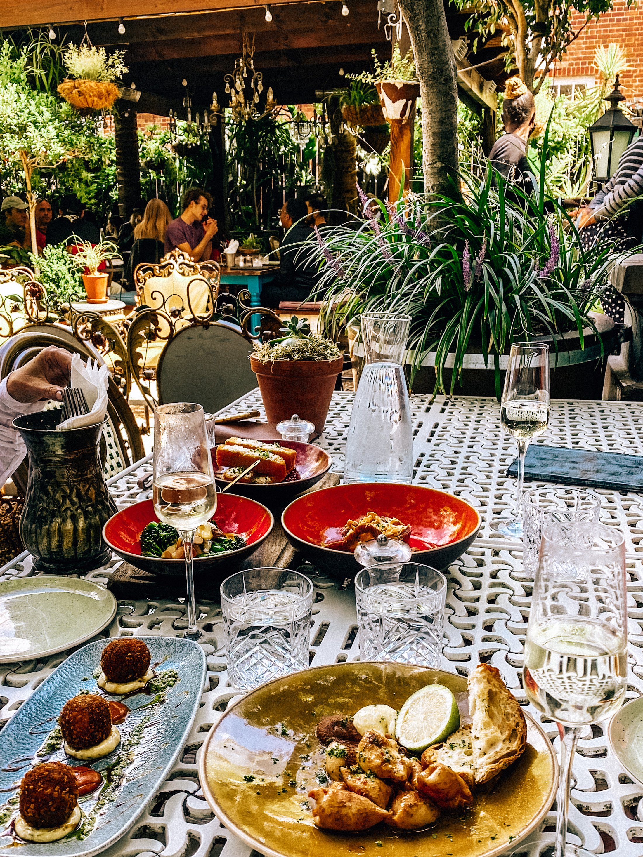 Our Local is an eclectic brunch/lunch greenhouse setting furnished with antiques, plants everywhere, and quirky touches like chairs hanging from the ceiling. Obsessed with the Shakshuka!