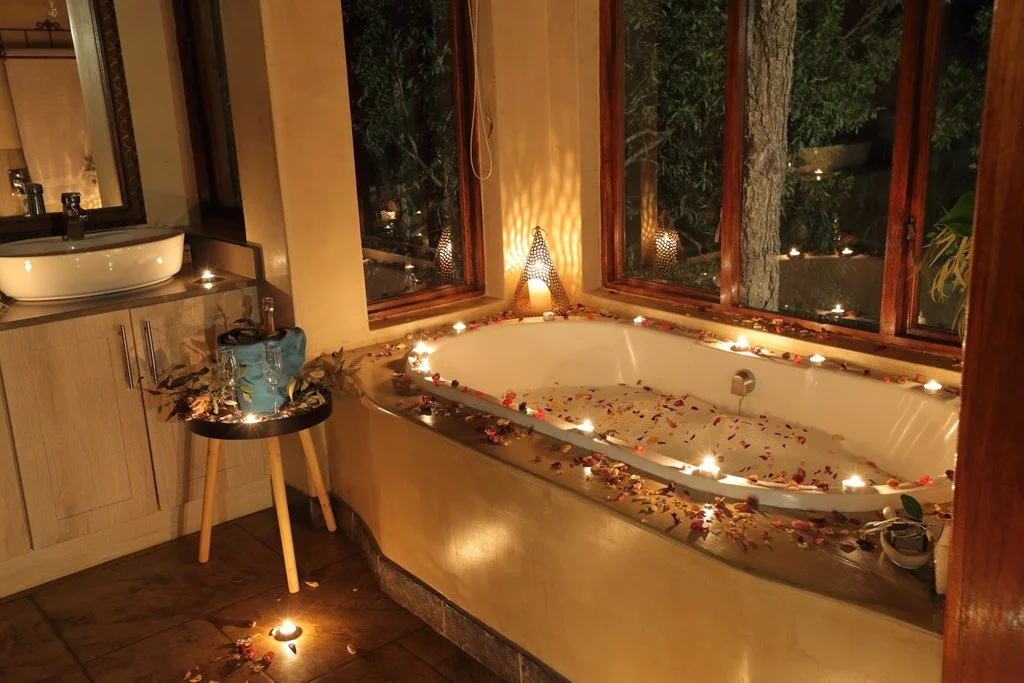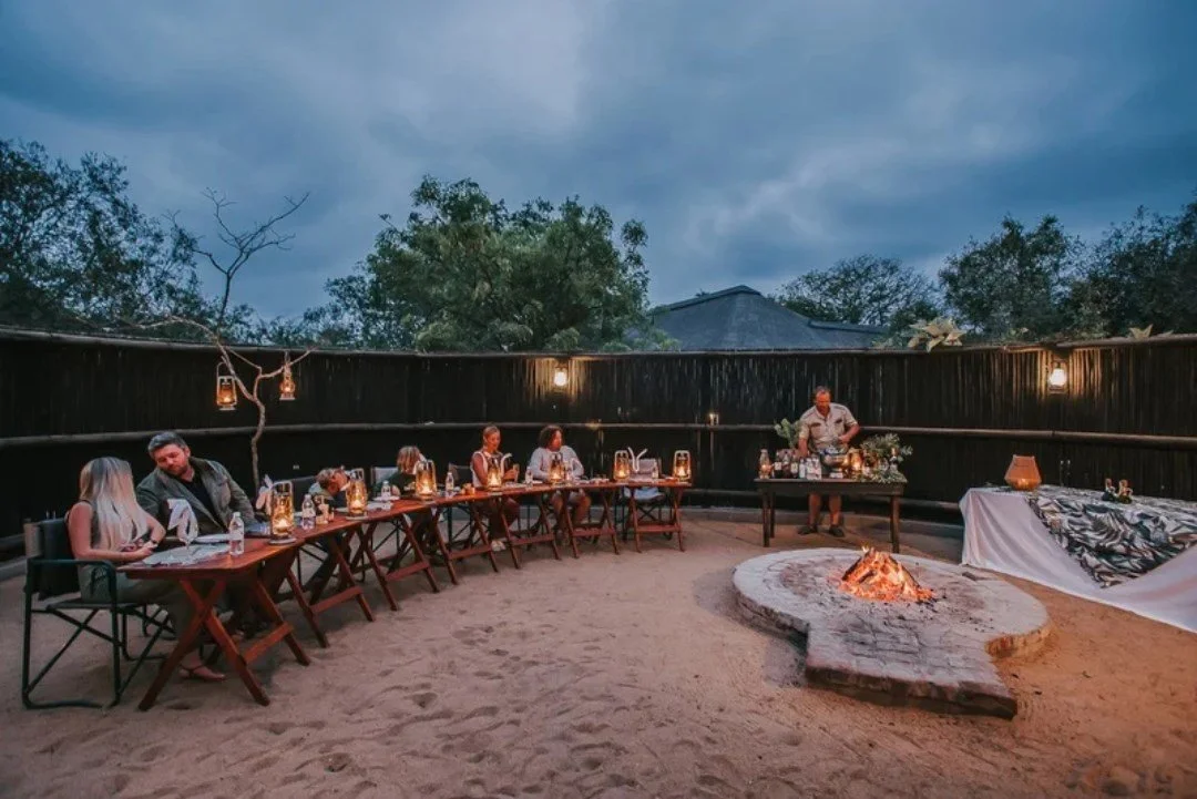Extreme privacy, superb facilities, and personalised attention ensure every guest enjoys a comfortable and relaxing stay, interspersed with exciting animal encounters. Communal areas include an informal lounge and dining area where guests spend many happy hours exchanging stories over refreshing drinks and expertly prepared meals. An elevated outdoor deck offers excellent views over the nearby waterhole with its many furred and feathered visitors and the secluded swimming pool is a welcome indulgence on hot summer days, with its cool waters, green lawns, and comfy sun loungers. When evening falls, glimmering lanterns lead the way to a traditional African boma for fireside dining against a backdrop of the bush chorus.
